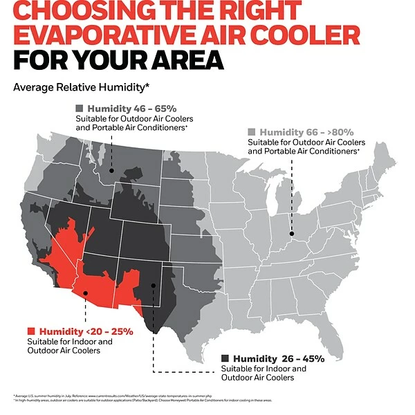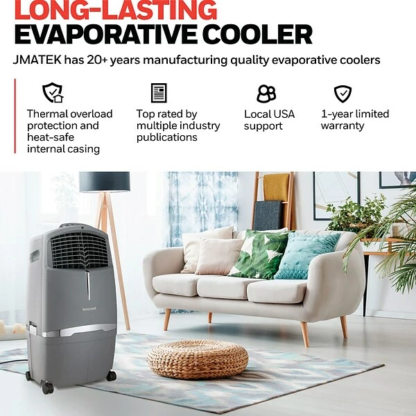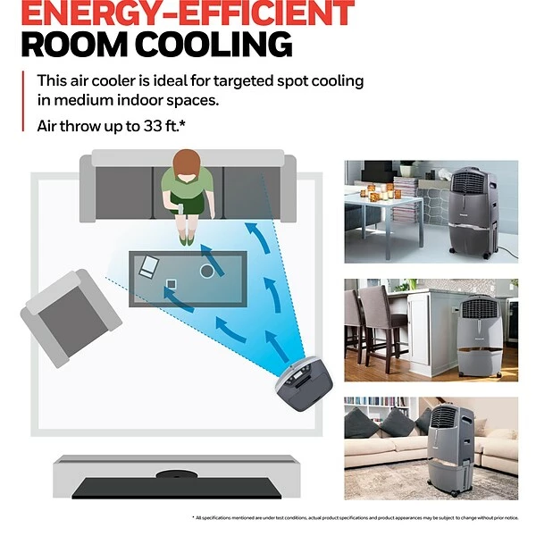 - Portable evaporative air cooler for indoor use cools rooms up to 320 sq. ft