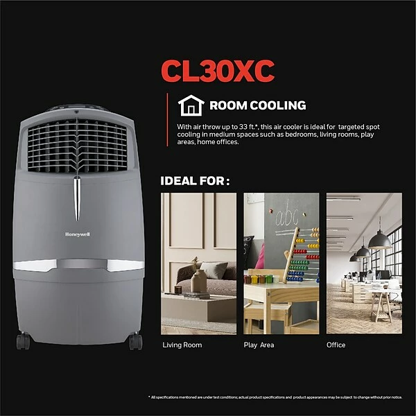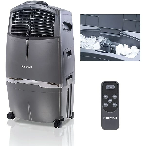 Honeywell® 63 pint Evaporative air cooler in gray color has carbon dust filter that cleanses the air. Cooler offers a top loading ice compartment and remote control settings to operate across the room.