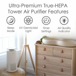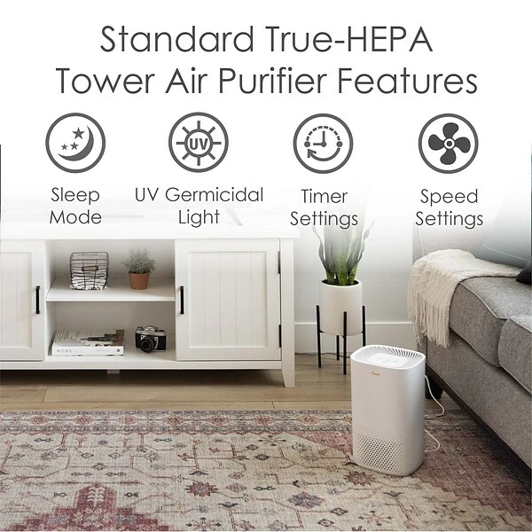 Get comfortable with the air quality in your home with Crane’s innovative standard tower UV air purifier. Crane’s purification system includes a pre-filter, true HEPA filter, and UV lamp. Equipped with a UV lamp, Crane’s standard tower air purifier removes bacteria and germs from the air. With 3 speed settings, and 3 timer settings, you choose how you want to run the show. Crane’s standard tower air purifier provides up to 250 sq. ft. of coverage and will efficiently clean your indoor air by removing pollutants from your home, all the while contributing to your home’s decor.