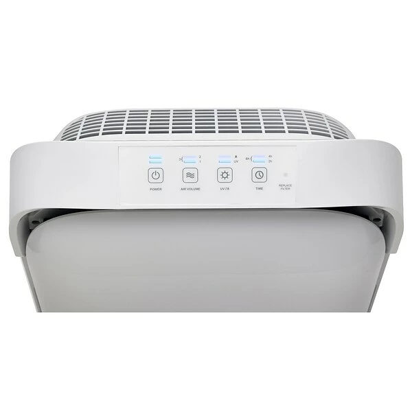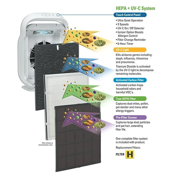 - Four-in-one air purifier with HEPA filter, UVC sanitizer, and odor reduction