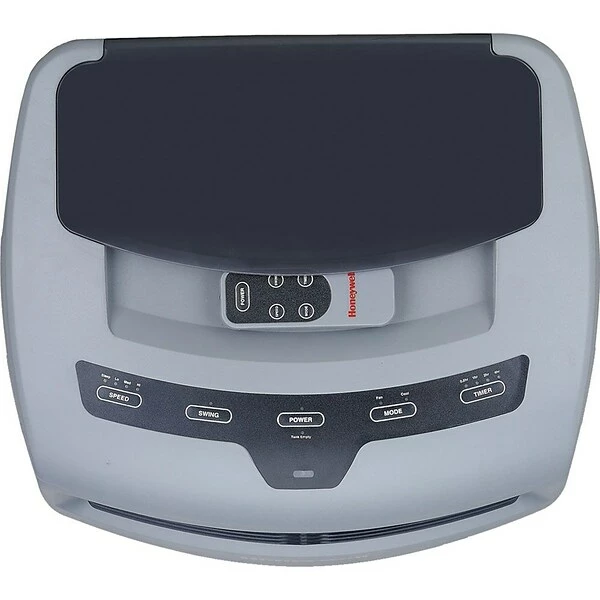 Honeywell® Evaporative air cooler in dark gray color features dehumidification up to 52 pints per hour with 4 speed control. Conditioner comes with 24 hr on/off timer and is weather-resistant for indoor/outdoor usage.