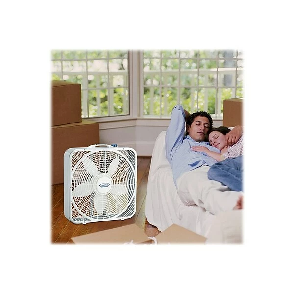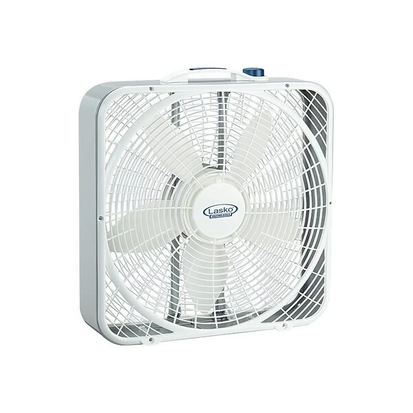 Cool offices, bedrooms, lobbies and classrooms while maintaining easy focus by using this box fan featuring three quiet speeds. With a convenient handle and a top-mounted control panel, this fan helps bring comfortable temperature to any room. This Lasko box fan includes a Weather-Shield to protect the motor from weather, making it suitable for window or outdoor use.